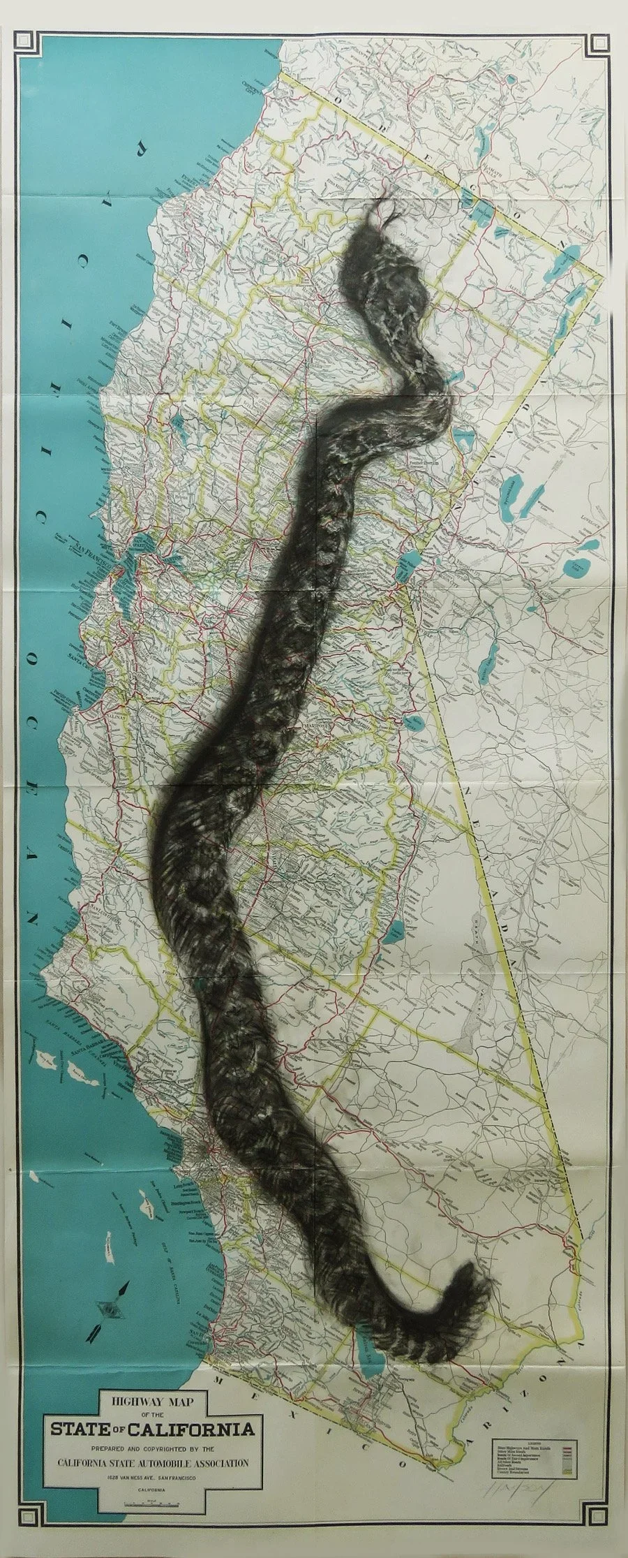 Lynn Hanson, Calfornia Roadtrip: Salvation Mountain to Mount Shasta, charcoal on 1930 highway map of the State of California, 42 x 16, 2022
